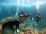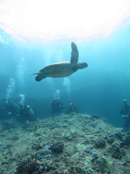 今日は、兵庫県からお越しのヨシノリさん&ミナさん、そして東京からお越しのシンジさん&シオリさん、そして本日がハワイダイビング最終日の山下さんファミリーをノースショアへご案内。水中をゆっくり移動しながら約60分、海亀や沢山お魚を見ていただきながら楽しみました。