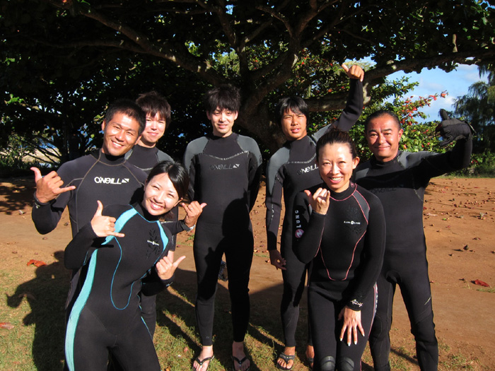 今日は鹿児島県からハネムーンでお越しのケイさん&リョウコさん、そして静岡県からお越しのタカホさん&カズマサさん、そして今回のハワイ最終ダイブは四日目の藤本さんファミリーをノースショアへご案内。何時もの様に、シマハギ・ゴマニザ・クロハギ・ヒメジの群れや海亀と泳ぎながら、美しいハワイの水中で沢山の思い出を作っていただきました。