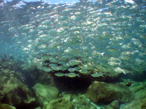 涼しい風が吹く気持ち良い天気です。そんな中、東京から今年2回目のご参加、Naotoさん&Megumiさんとノースショアへ。今日は南がウネリ気味ですので、反対のノースショアは穏やかでした。引き潮の最中で透明度が気になりましたが、17m前後と問題ないコンディションです。何時ものように出発直後の魚の群れに歓迎?されながら、徐々に奥へ奥へと進みます。静かな水中ではシマハギ・クロハギの群れが楽しさを演出してくれました。