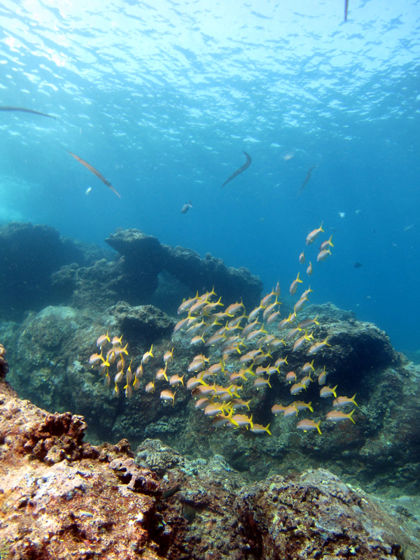 南の高いうねりの影響で、今日は急遽、今年初のノースショアへツバサさん&ヤスヒロさんをご案内。ノースショアの海況は非常に良く、昨年と同じ様にシマハギ&ゴマニザ&アカヒメジの群れを見ながら、水中の洞窟をくぐりました。