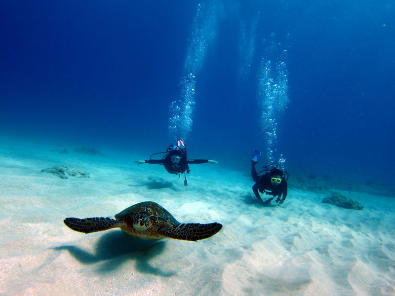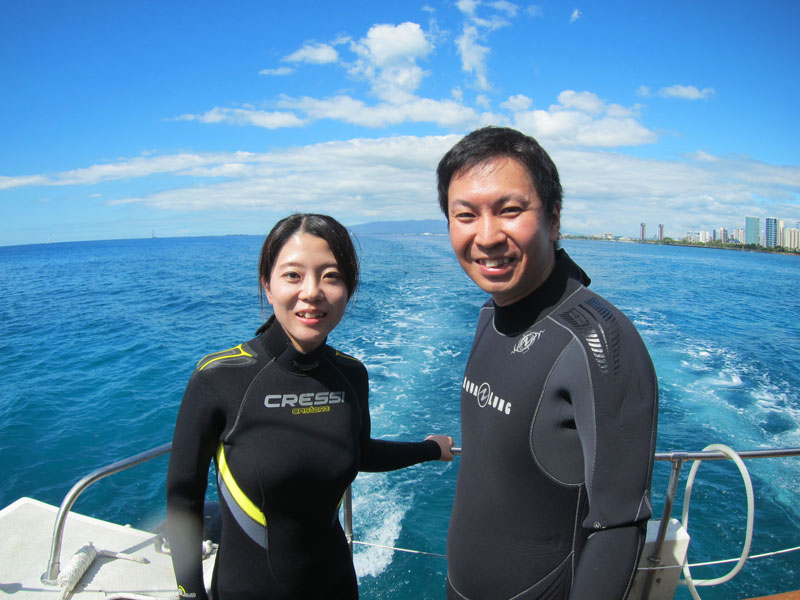 今日は、ハネムーンでお越しのかずのりさん&えりさんを南の初級ボートダイビングへご案内。水中は今日も大変綺麗です。真っ青な水中と白い砂地の上を海亀がゆっくりと泳く光景は、潜った人にしか分からない贅沢な時間です。ハワイでしかできないこんな体験、如何ですか?