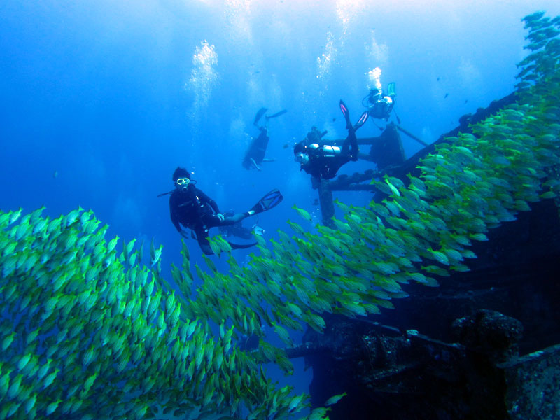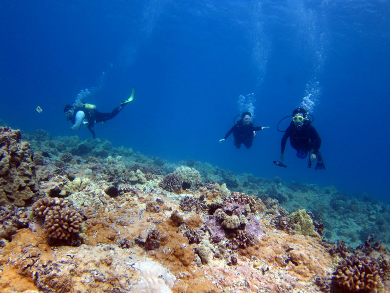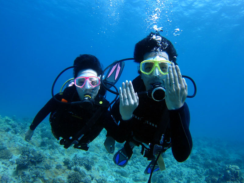 今日はハネムーンで尾坂からお越しのまさひろさん&みずほさん、そして東京からお越しのしげみさんを上級ダイビングにご案内。巨大沈船シータイガーには大きな海亀、そして船内を悠々と泳ぐ鮫、他にもムレハタの群れや竜巻の様に群れるヨスジフエダイ…。今日も皆さんにハワイの思い出を作っていただきました。