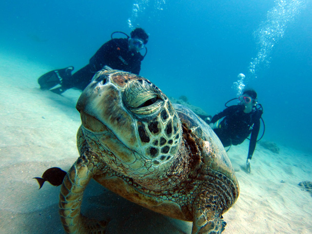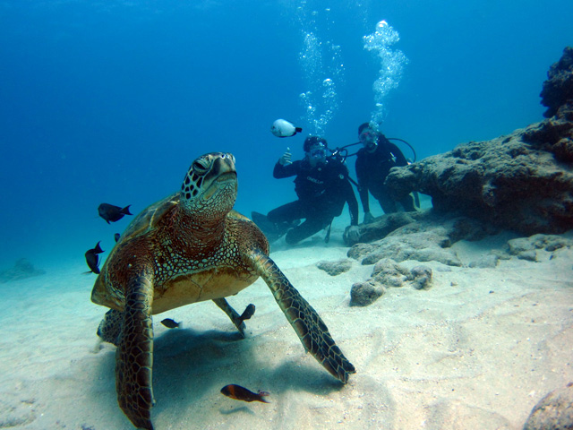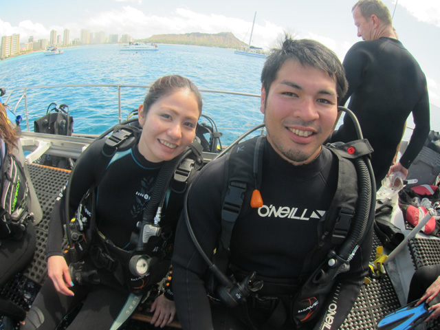 今日は沖縄からお越しのシュウサクさん&モモコさんを南の初級ボートダイビングにご案内。海亀がいっぱいのワイキキキャニオンズに潜り魚の群れに囲まれ、体長180cm程のかなり大きな鮫に大接近。以外にも沖縄でも潜らないお二人に、ハワイで大きな経験をして頂きました。