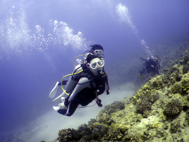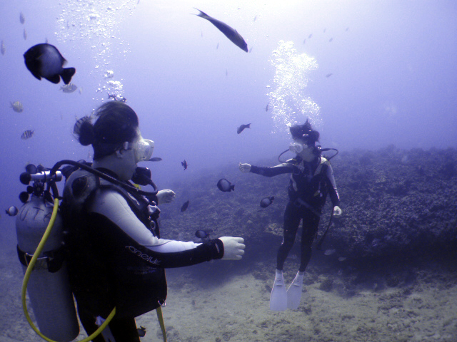 ノースショアにでっかい波が入り始めました・・・高さ2.4mですって。今年のノースショアは終わっちゃいました。しかしご心配要りません!その分ボートで本格的なダイビングが楽しめますよ。ということで岩手からお越しのお二人、Satokoさん&Kanakoさんを南の初級ボートへご案内。こちら(南側)は穏やかなコンディションです。ダイビング未経験のお二人ですが・・・“あれ?何とも無いの?本当に平気?”と言うくらいにあっさりと潜っちゃいます(やる~!)。2本のダイビングで沢山の魚や海がめと遊び、しっかりと楽しんでいただきました。