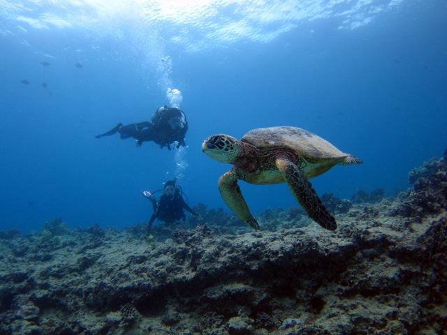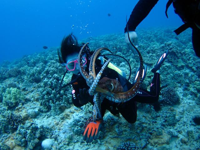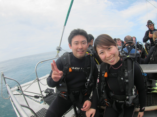 今日は名古屋からお越しのユウキさん&トモミさんを南の初級ボートダイビングにご案内。勿論沢山の海亀はきっちりと見て頂き、その後は珊瑚の上を悠々と散歩。そこに大きなタコを発見!トモミさんは腕に絡みつくタコと決闘→勝利!そんな楽しい水中での時間を過ごしていただきました。