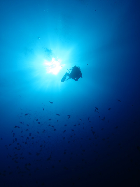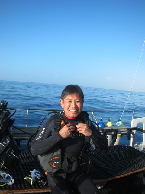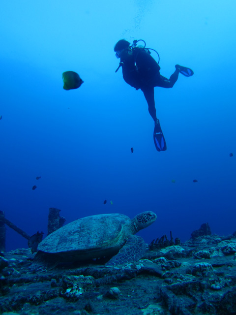 今日は、一年かけて世界一周旅行中の立ち寄り?でハワイご滞在中のムネタカさんを南の上級ボートダイビングへご案内。穏やかな水中の沈船SeaTigerへ潜ると、船体では大きな海亀がお休み中。大きな魚の群れを見たり船内を通過したりと、深ーい一本目を楽しみます。2本目にはいくつかのリーフを渡りながら、カラフルな魚や海亀、そして鮫を見て頂き、ハワイのダイビングを楽しんで頂きました。