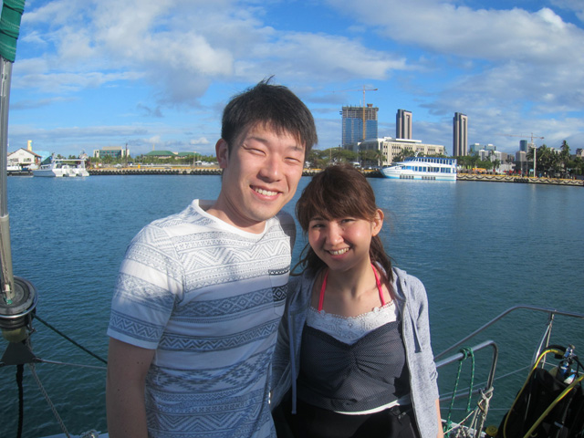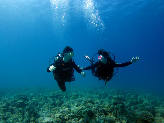 今日は、ハネムーンでお越しのイイヨさん&ヒロトさんを南の初級ボートへご案内。風も弱まり水中も真っ青で綺麗!珊瑚脳へを進み、いつも海亀と鮫が要るポイントへ。他にも沢山の魚に囲まれながらハワイハネムーンの大きな思い出を作って頂けました。