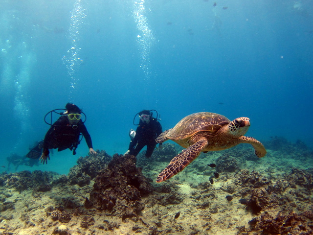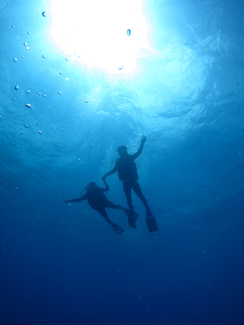 今日は三重県からハネムーンでお越しのヒロキさん&ミホさんを南の初級ボートダイビングへご案内。今日も海は良いコンディション!真っ青な水中を進めば、すぐに何頭もの海亀た魚達がお二人を出迎えてくれました。