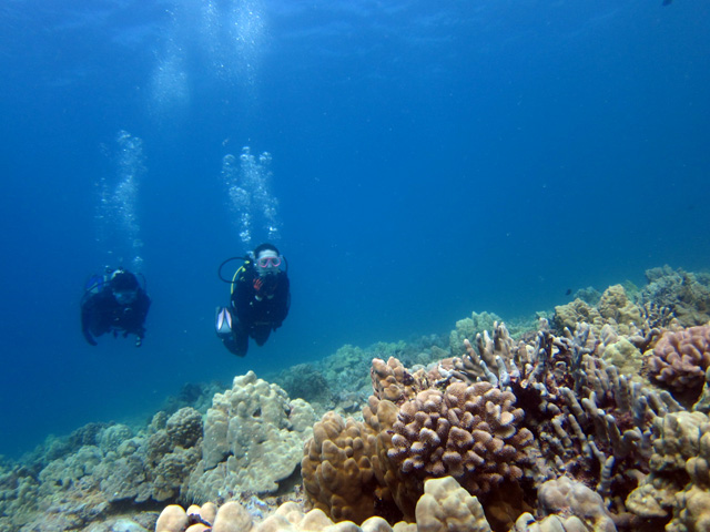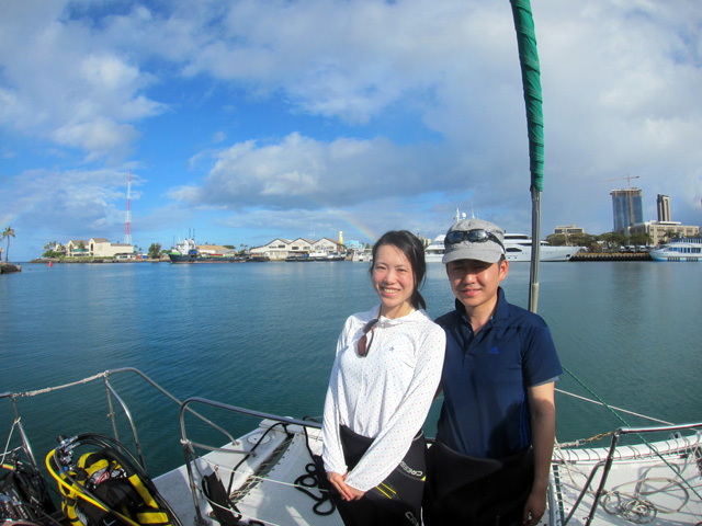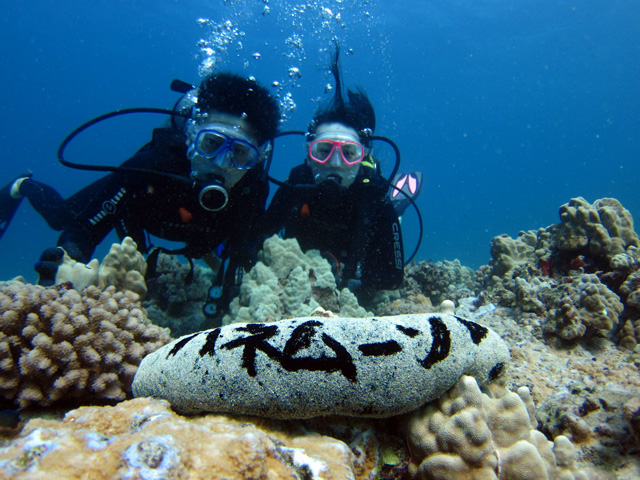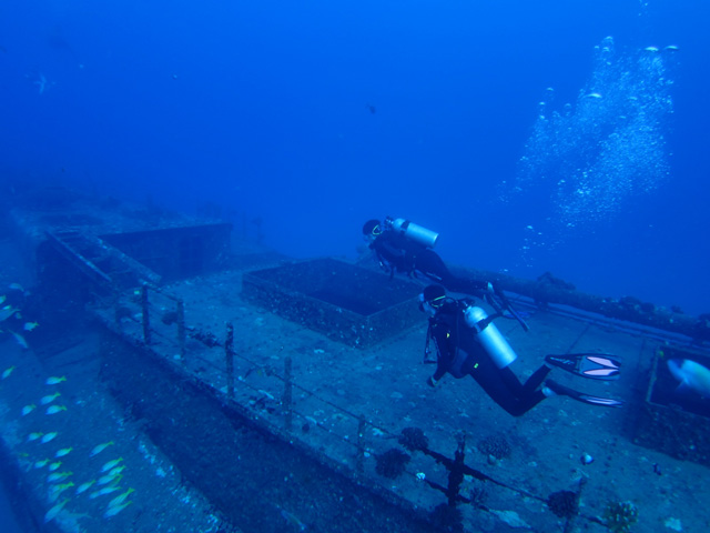 今日はハネムーンでお越しのハヤトさん&サチコさんを南の上級ボートダイビングにご案内。巨大な沈船シータイガーは透明度40m。流れもないコンディションで初ディープをこなします。そして2本目ではしばらく鮫を観察し、リーフの上をゆったりと水中散歩。今日も無事に楽しんで頂けました。