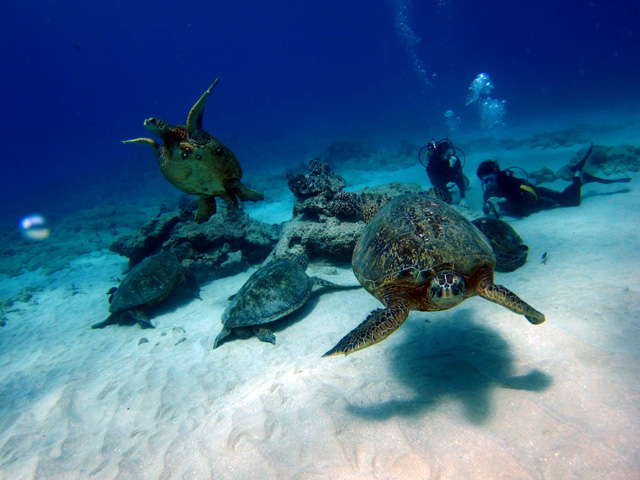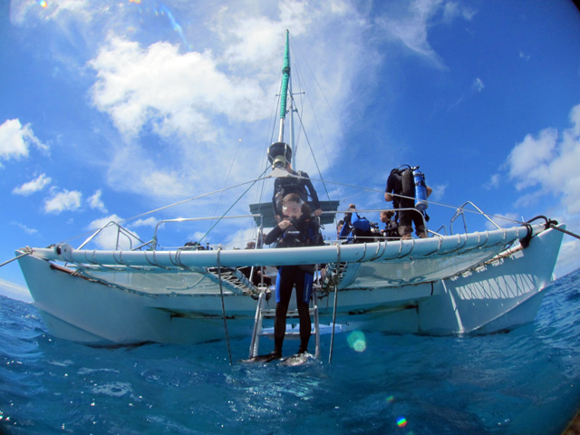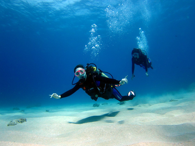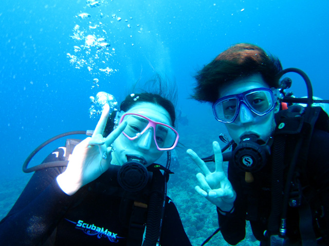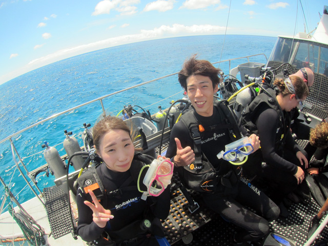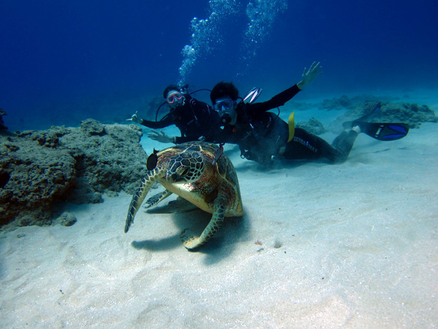 今日は二度目のご利用、レオさんとシホリさんを南の初級ボートダイビングにご案内。水中は綺麗!透き通って真っ青です。沢山の海亀と思う存分遊び、魚の群れと一緒に泳ぎ、鮫にも大接近!(怖くありませんよ(^^)。今日も真っ青な世界で思いっ切り楽しんで頂きました。
