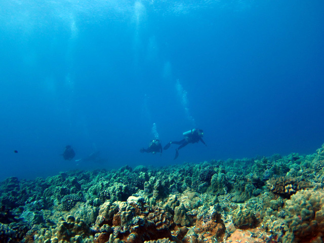 今日は東京からお越しのミカコさん&リュウさん、そしてコウヘイさんを南の上級ボートダイビングにご案内。少し流れがある深い沈船では、船内と通り抜けたりそこに住み着くヨスジフエダイの群れを見ながら楽しみます。風除宇宙には大きな海亀も…。そして二本目は、じっくりとリーフを45分間ほど水中散歩。海亀や鮫、沢山の魚と真っ青な世界を楽しみながら、今日もハワイのダイビングを楽しんで頂きました。
