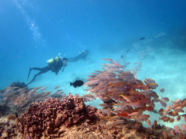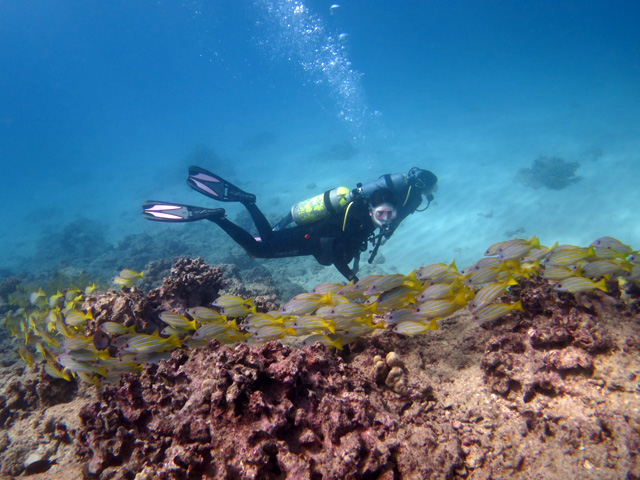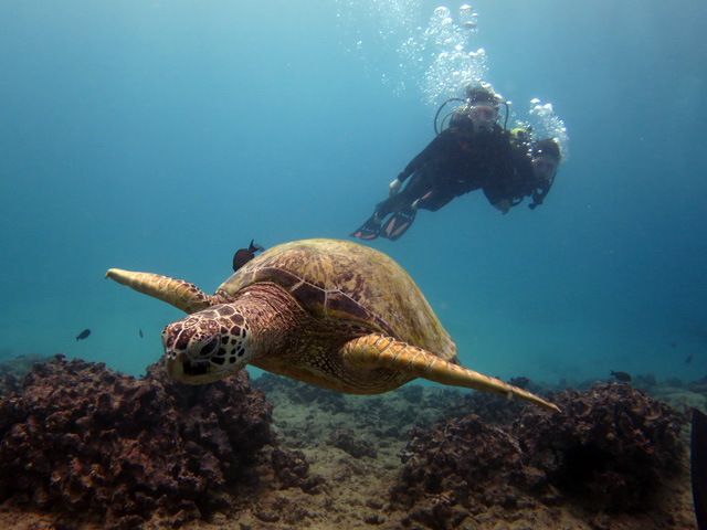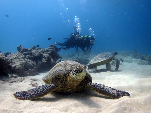 今年の冬は珍しく悪天候が多いハワイ。ちょくちょくツアーが中止になりました。が、今日は晴れ。マナミさん&ユリコさんを南の初級ボートダイビングにご案内。ワイキキキャニオンズには、何時もの様に海亀が沢山!他にもヨスジフエダイの群れやヒメジの群れを突き抜けます。2本目のノーチラスリーフでは軒下に隠れる鮫、リーフに住み着く沢山の綺麗な魚を見て頂きながら、ハワイスキューバダイビングの思い出を沢山作って頂きました。
