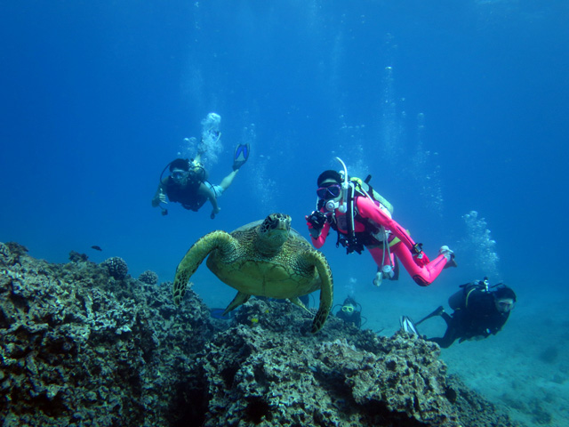 本日三日目のご参加はツカサさん&ヨシノリさん、そしてこちらも東京からお越しの及川さんご家族を南の上級ボートダイビングへご案内。ロープを伝いながら潜行すると、全長50m級の大きな沈船に到着。船体を回りながらそこに住み着く大きな海亀やヒメジやフエダイの群れなどを見ながら深いダイビングを楽しみます。2本目は水深14m程度までのリーフデ水中散歩。サメや海亀、沢山の魚を見ながら、ゆったりのんびり…ハワイのダイビングを楽しんで頂きました。