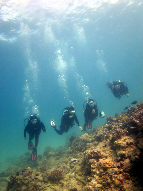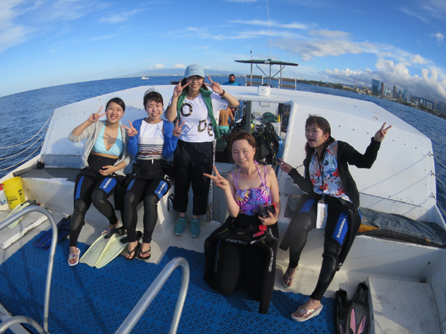 今日は社員旅行の仲良し女子会5人チーム、ゆさん、あゆみさん、かんなさん、あゆみさんを南の初級ボートダイビングにご案内。水中に入れば音がなく青い世界が広がっています。水底を進みながらサンゴ礁に住み着く綺麗な魚や海亀を見て頂き、ハワイでの楽しい思い出を作って頂きました。