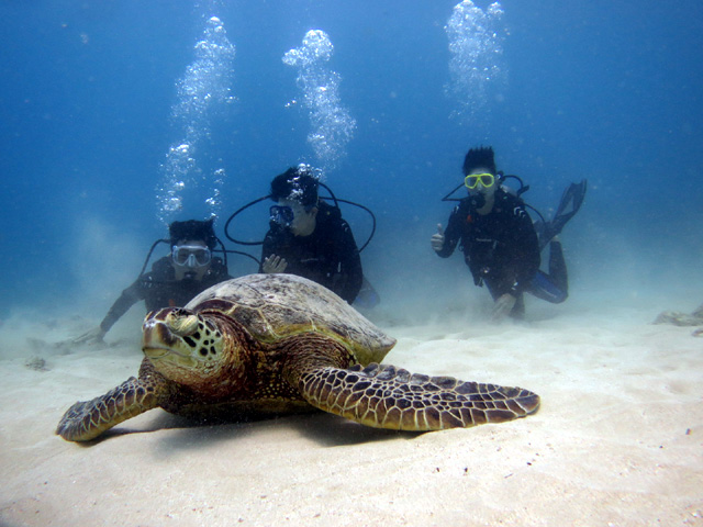 今日の午後は、熊本から卒業旅行第一弾としてハワイにお越しのかずまさん&はやとさん&こうすけさんを南の初級ボートダイビングにご案内。2回のダイビングではたくさんの海亀や策んさんの魚、そして水中で歩いてみたり空位でわっかを作ったりしながら、ハワイのダイビングを楽しんで頂きました。