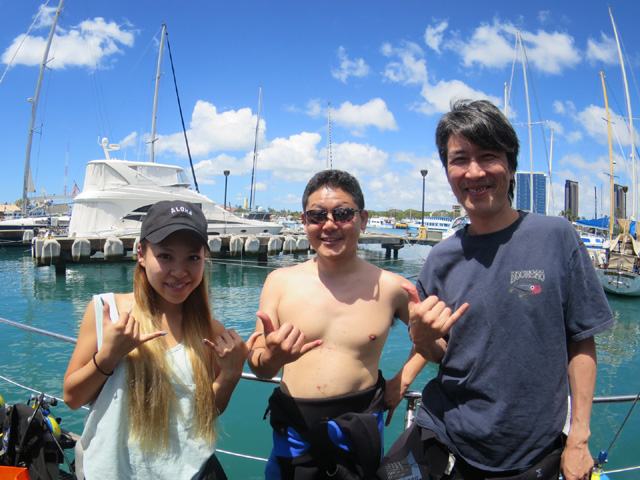 今日は毎年この時期にハワイ入りする尾上さんチーム、そして神奈川県からお越しのあやこさん&ようこさんを南の初級ボートダイビングにご案内。今日もハワイは快晴!海も青々をしています。水中に入れば、直ぐにたくさんの海亀があちらこちらに…魚の群れもじっくりと見ながら、ハワイのダイビングを楽しんで頂きました。