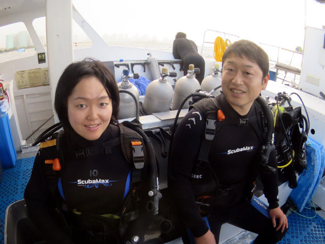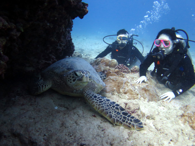 今日は東京からお越しのやすあきさん&あやねさん、そして茨城県からお越しのとしきさん&なつこさんを南のボートダイビングにご案内。水深35m、全長54mの沈船ポイント、一本目のSeaTigerにはヨスジフエダイの群れや鮫を見ながら、船内を通り抜けて遊びます。二本目のHoshuReefには沢山の綺麗な魚達や何頭もの海亀が悠々と暮らしていました。