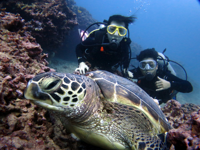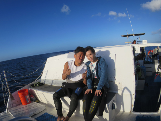 今日は名古屋市からお越しのえいじさん&えみさんご夫婦をご案内。水面から3m程下りたら水中は大変綺麗。ヒメジの群れや沢山のチョウチョウを見ながら行くりと進むと、大きな海亀が4頭お休み中。今日もきっちり海亀にも会え、50分間のダイビングを楽しんで頂きました。