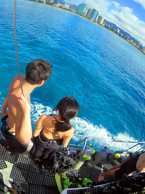 今日は卒業旅行でお越しのあやとさん&ゆりさんを南の初級ボートダイビングにご案内。海亀天国のワイキキキャニンズで50分間+のダイビング。沢山の海亀は勿論、至る所で群れや綺麗な色の魚と一緒に泳ぎ、あまりにも余裕があるのでまたしても水中で仲良くお散歩も…。初めてのハワイでこんな贅沢な経験をして頂けました。