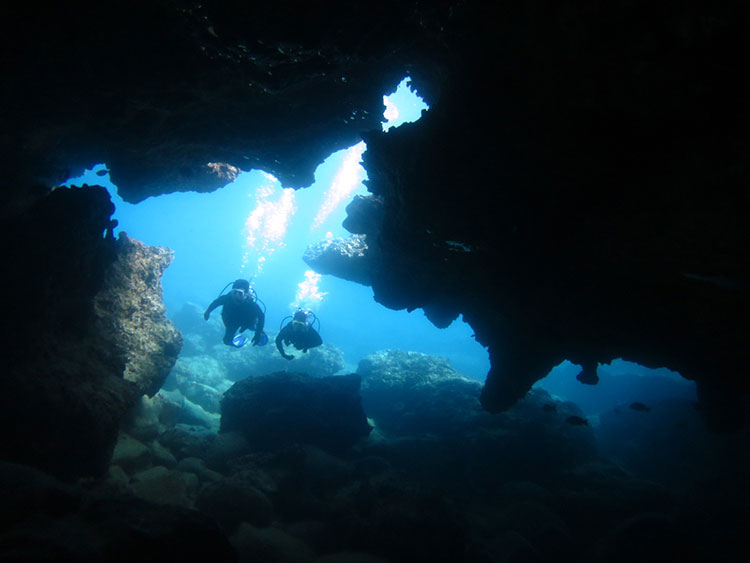 今日は凪ノースショアへ、のりあきさん&しんやさんをご案内。静かな海の中をゆっくり進み、魚の群れを抜け洞窟の入り口へ。中へ入ると真っ青に光る出口は最高の景色。食事中のウミガメをしばらく見たり綺麗な魚をじっくり見たりしていただきながら、今日は61分間のダイビングをじっくりと満喫していただけました。