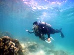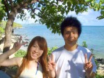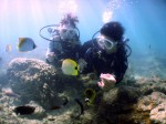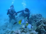 本日は晴天なり!すっきりと晴れて気持ちがいい風が吹いています。今日は岐阜県からハネムーンでお越しのTakeshiさん&Aiさんを、初級ビーチダイビングへご案内。何時のように浅瀬で練習、そしてGO!。徐々に沖へ移動しながら餌付けポイントへ。お二人とも全く平気、いたって順調にダイビングを楽しんでいる様子です。ここでは人懐っこいトゲチョウチョウウオが必ず近づいてきますが餌が欲しいのでしょうね・・・しかし餌は持っていませんおで、餌付けの真似だけ。そして海がめを探しながらリーフの中をのぞきます。すると海がめではなくサメが隠れていました。お二人にサメを見せると一瞬“ギョッ!”としながもしっかり観察しています。このサメは襲ってきませんが、反対に脅かさないように気をつけます。そして30分間のダイビングが終了。水面を見上げても、空の青さがよく分かりますねぇ・・・。お二人ともすっかり気に入っていただけたようで、休憩後にもう1ダイブしました。Takeshiさん&Aiさん、ご結婚本当におめでとうございます!これからも仲良しのままでいてくださいね。今度はもっとすごいところでダイビングしましょう!ALOHA!