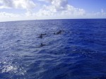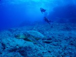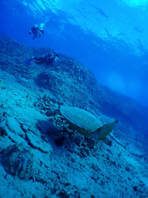 青くはれたハワイです。今日は一昨日ご参加のHajimeさん&Eriさんハネムーナーお二人を、東の上級ボートにご案内しました。今日は偶然、ボートカシキリ!。他には誰も乗っていません。幸運な船出です!さらに海況も最高と言うわけで、一本目から“SpittingCave”でのドリフトへ。エントリーするとキラキラとした水中は真っ青に透き通っています。ゆっくりと西へ向かって、壁際をドリフト。あたり一面丸見えで本当に気持ちが良いです。このポイントは海亀の往来が多く、あっちからこっちから何頭もやってきますので、ここでは海亀と一緒のに泳ぐ写真が撮りやすいのです。横穴をのぞいたり、ヒメジの群れを通り抜けたり、マダラトビエイとすれ違ったりしながら、最大18m/38分間のダイビングを満喫していただきました。そして二本目に向かう途中にお二人への結婚祝いが・・・今度はイルカの群れに遭遇!約40頭くらいのハワイアンスピナードルフィンが船を囲い、お二人を楽しませてくれました。コンディションが良いので、練習も兼ねて二本目もドリフトで“KokoCraters”へ。こちらも水中丸見えです。「キューキュー」と言うイルカの鳴き声を聞きながら西へ。海亀に会いながらもイルカが現れないか・・・?と気にしながらのダイビングでした。ハネムーンのHajimeさん&Eriさんには、ハワイの青い海を十分に楽しんでいただけたようです。これからもお幸せに!ALOHA!