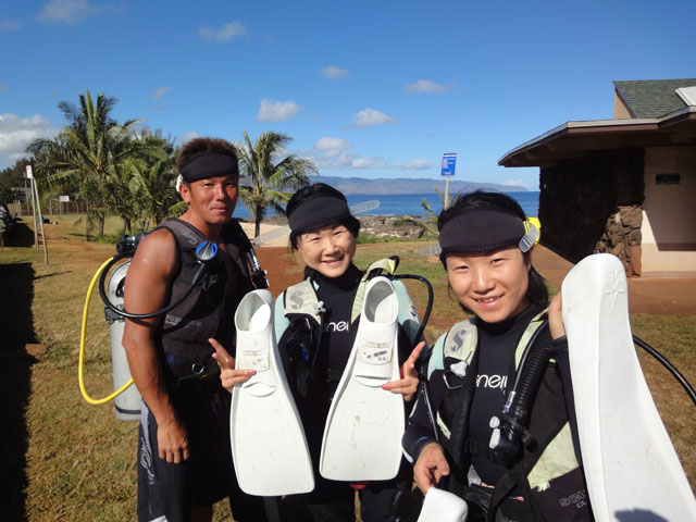 昨日は少し波が出たらしいノースショアですが、既に穏やかな海況に戻っていました。今日は愛知県からお越しのYoshikoさん&Satomiさんシスターズと、本日ハワイのダイビング最終日になってしまったマッスル永井さんをご案内。エントリー直後は何時もの大きな魚の群れを突き抜け?て進みます。シスターズは既に自前のカメラで写しまくりモード・・・。そして今日もシマハギ・ゴマニザ・クロハギの群れを見ながらメインケーブに入ります。少し暗い洞窟の中をゆっくりと抜けたところには、何時も海亀がいるのですが・・・今日はいません。その後もいくつかの洞窟を通り抜けて、やっと見つけました!大きな海亀。勿論、シスターズは取り付かれたように写真を写しに写しています。・・・が、一人だけ空気がみんなの半分・・・トホホ。仕方がないのでスクーバ器材ごと交換してあげました。その後も変化してゆく地形を楽しみながら、そして沢山の魚を見ながら65分間のダイビングは無事に終了。休憩して着替えを済ましたらビーチを出発。今日は日曜日、ハレイワで朝市が行われていましたので少し見学。造園業を営んでいる永井さんは、日本では見ない植物に興味津々です。写メで写しているのはレッドジンジャー。と、こんな感じで今日も楽しく終了です。ALOHA!