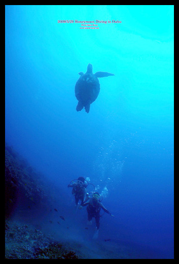 しばらく見ていると海がめはがゆっくりと動き出したので“一緒に泳いで下さい”のサインを出します。カメの後をゆっくりと着いて行きながら、よさそうな場面を“パシャ!パシャ!”。海がめと一緒に数十枚の写真が撮れました!