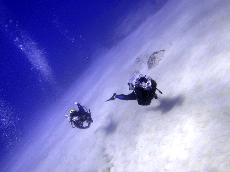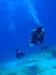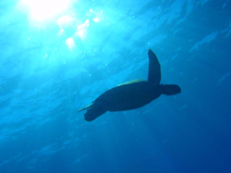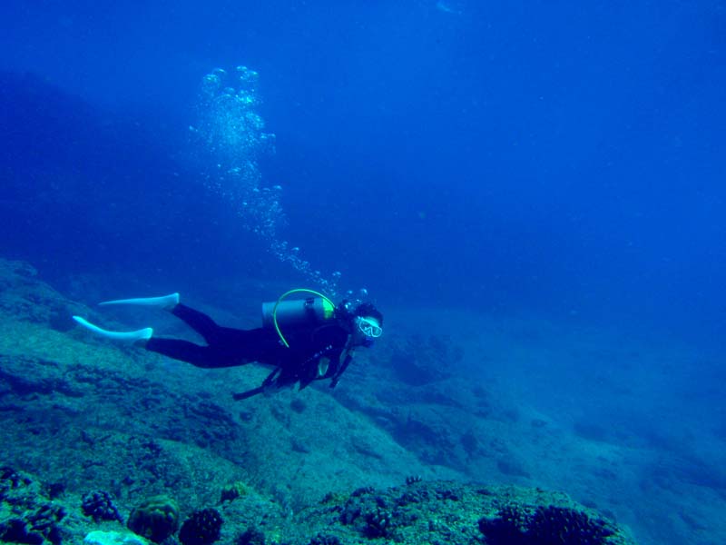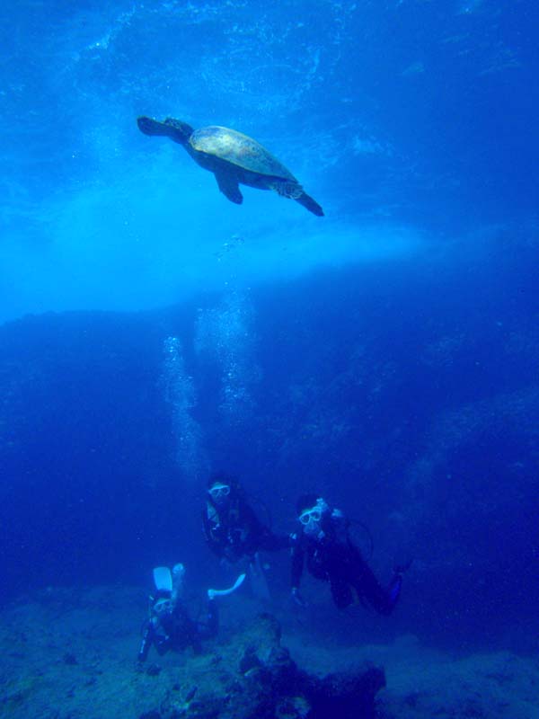 ・・・の予定が、時間つぶしに半島ツアーに出かけた途中でクジラを見るために立ち寄った”BlowHole”の海況が、珍しくも殆どパーフェクトな状態です!と言う事で、ほぼツアーで行くことがないレアポイントの“BlowHole”で2本のダイビングをすることに。水中では何頭もの海亀や、崖っぷちに住み着く沢山の魚やを見ながら、次々に変化してゆく地形を楽しみます。そして水面から差し込む美しい太陽の光が白い砂地にキラキラと映る光景もここでの見所です。朝から大問題を抱える一日でしたが、BlowHoleでの美しいダイビングが問題の全てを消してくれました。ALOHA!