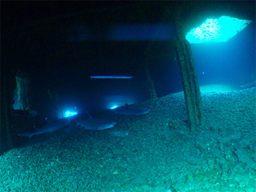 じっくりカメを見たら、次はサメを探します。すると居ました・・・。今日はホワイトチップシャークが3頭並んで隠れています。
