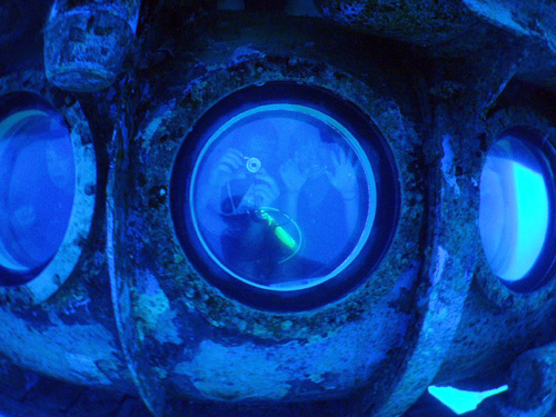 潜水艦の窓越し中を見ると、乗っているお客さんがこちらを見て懸命にカメラやビデオを撮っています。カメラに向かって手を振ったり、ジャンケンポンをしたり・・・潜水艦のお客さんと少し遊んであげました。