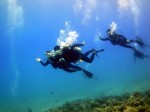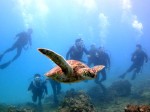 朝からよく晴れて気持ちがいいハワイです。今日は名古屋からお越しのYOSHIMASAさん、HIROTAKAさん、SINTAROさん、TAKANARIさん、NAOKIさん、KOUKIさん、TAKAYUKIさん、YUYAさんの8名グループを南の初級ボートダイビングにご案内。一本目のポイントは南の海がめ天国“WaikikiCanyons”へ。水深8mまでゆっくりと下りながら、緊張をほぐします。移動開始から数分で3頭の海がめがいました。あまりの近さに皆さん興奮気味=呼吸が少々乱れ気味+ジタバタしてます。海がめとしばらく遊んだ後はさらに沖に向かって移動・・・するとまた次の海がめがいました。35分ほどのダイビングを楽しんでいただき休憩。2本目のポイントはさらに真っ青な“NautirusReef”へ。二本目になると、皆さん要領をつかめたのか、スイスイと自由に泳げるようになります。真っ青な水中ではリーフと砂地を行き来しながら沢山の魚と遊んでいただき、ダイビングは無事に終了です。ALOHA!