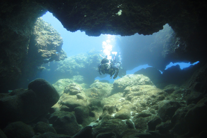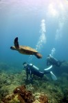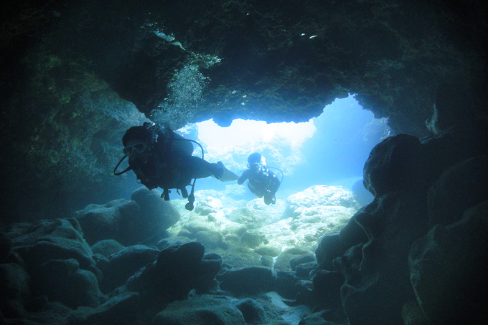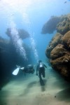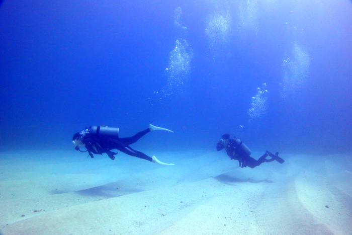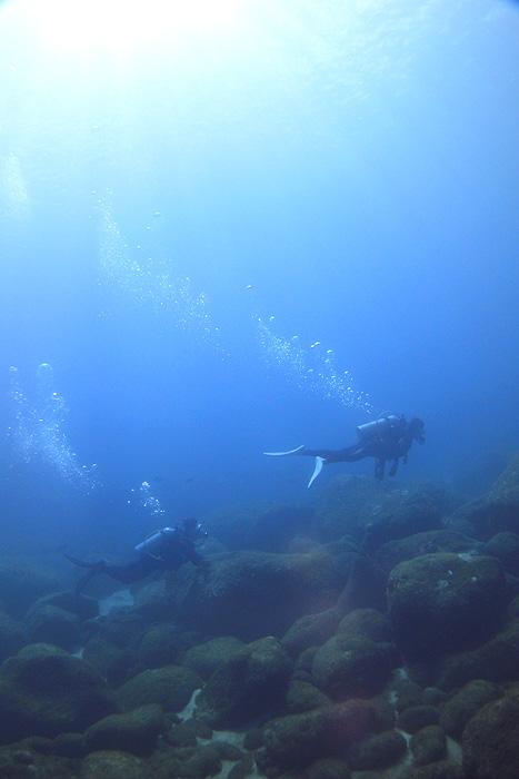 やや強い風が吹き続いた夜でしたが、今日は朝からいい天気の中、昨年9月にご参加いただいたTomoyaさん&Sakiさんを、晴天のノースショアへご案内。今日は一本目“シャークスコーブ”、二本目“BigTube”へ。一本目は、何時ものようにゆったりと進みながら最初の洞窟までおよそ15分。初めての水中洞窟に入って頂き、青く光った出口の光景を楽しんで頂きます。その後もいくつかの洞窟を抜けながら、シマハギ・ゴマニザ・クロハギの群れや海亀、数々のチョウチョウウオを見たり、砂地とリーフの変化を楽しんで頂きながら65分間のダイビングが終了。しっかりと休憩をとったら二本目です。開始数分後に海亀がユラユラと泳いで来たので、きっちり記念写真を数枚。そしてしばらく沖へ進みながら少々迷子?・・・方向を確認したら念のためにお二人の残圧チェック→Tomoyaさん残り半分・・・目的のアーチまではまだ5分ほど先です。少し外れたルートからそこを目指すにはやや不安・・・深さと時間を考えると帰りに空気がなくなる可能性もありますので、ここは控えめに進路をやや岸に向けます。そして別の洞窟を2箇所ほど抜けながら、沢山の魚と楽しい時間を。開始から60分過ぎあたりで水深を徐々にあげてゆきます。こんな感じで75分間の超・ロングダイブは無事に終了。10ヶ月ぶりの海を楽しんで頂きました。明日は東野上級ボートへご案内。ALOHA!