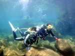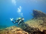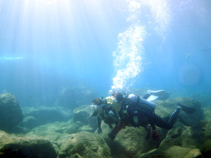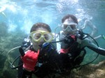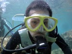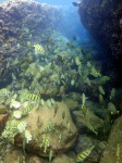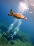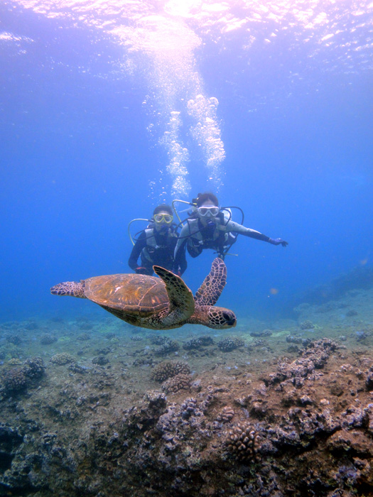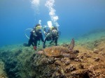 今日は、社員旅行なのにハレクラニ泊!と言うSanaeさん&Satokoさん&Yutakaさんをノースショアへご案内。ワイキキを出発してから、虹やパイナップル畑などを見ながら1時間15分でノースショアに到着。ゆっくりと準備を済ませたらダイビング開始です。この場所では、波打ち際から既に沢山の魚が泳いでいます。深くならない場所で、そんな魚を見ながらYutakaさんが満足!一足お先に浜に上がり休憩。他のお二人とゆっくり遠くへ。しばらくするとシマハギ・クロハギ・ゴマニザの群れが何時ものように現れます・・・そして洞窟を通過。更に水中散歩を楽しんでいると、子供の海亀が現れてくれました。5分程度海亀の後を着いて泳ぎながらゴール地点へ。今日も穏やかなノースショアの水中を楽しんでいただけました。