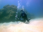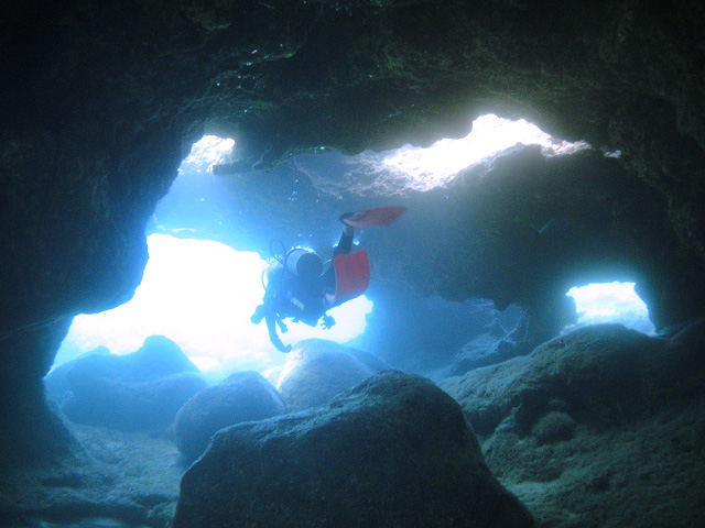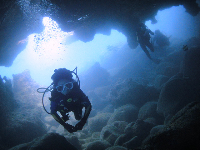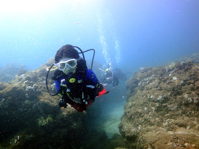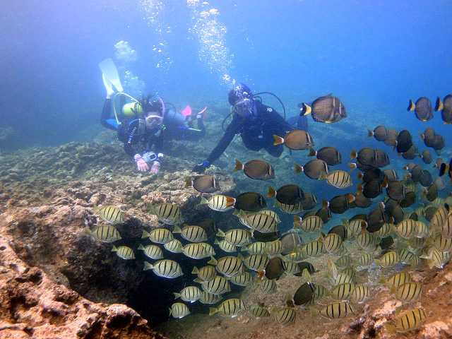今日もいい天気の中、1年1ヶ月ぶりに東京からお越しのTakashiさん&Tomokoさん、そして本日三日目!天才ダイバーのDaiki君をノースショアへご案内。今日は昨日に比べて少しだけ波がありましたが、それでも50cm程度の小さな波で問題なし→早速ダイビング開始です。ゆっくりと、何時もの魚の群れを掻き分けて進むと徐々に深くなってゆきます。そして砂地を通過しリーフを一山越えた後には洞窟が。天井にたまった空気が、まるで水溜りのように見える不思議な水中を楽しみながら外へ。その後も他の洞窟をいくつも通り抜け、砂地とリーフを通過します。そして今日もシマハギ・クロハギ・ゴマニザの群れに囲まれたり、上から差し込む光をゆっくりと眺めたりしながら、70分調度のダイビングを楽しみました。ALOHA!