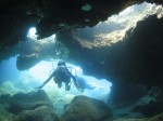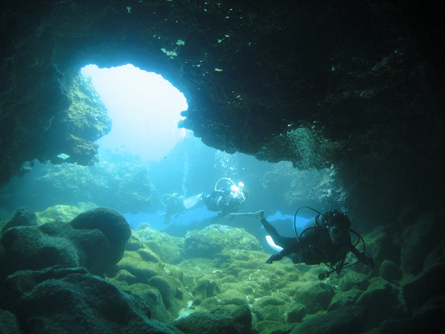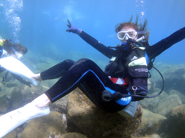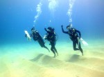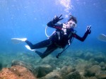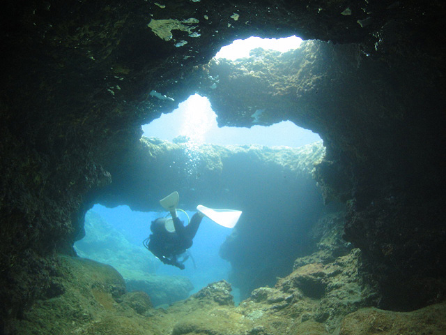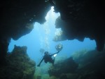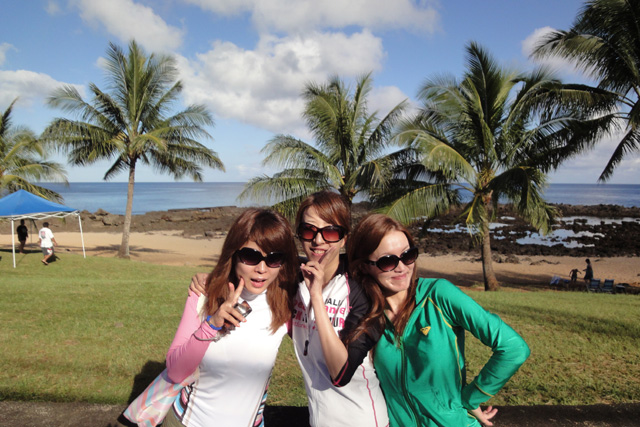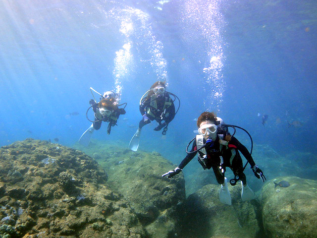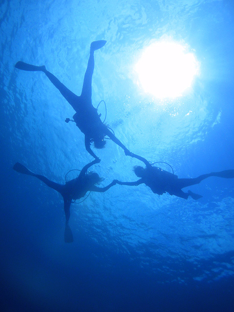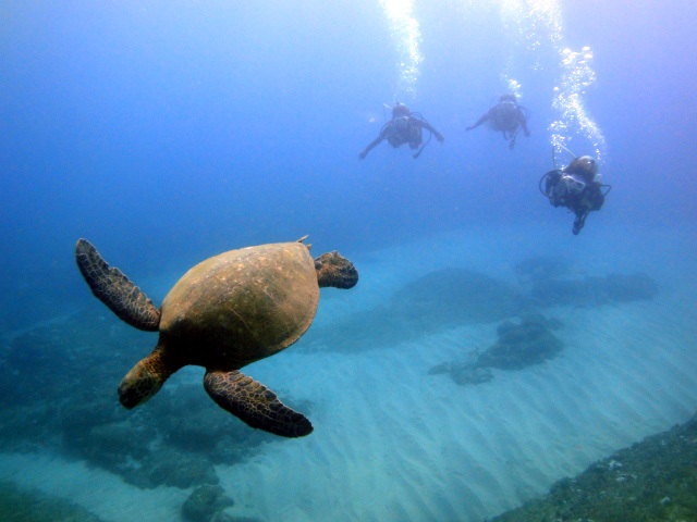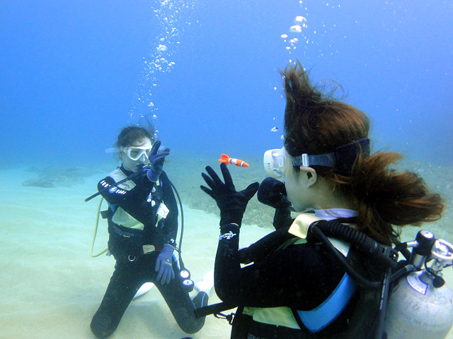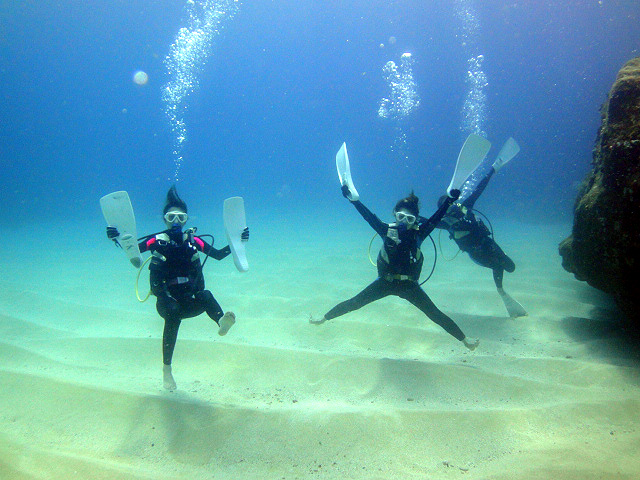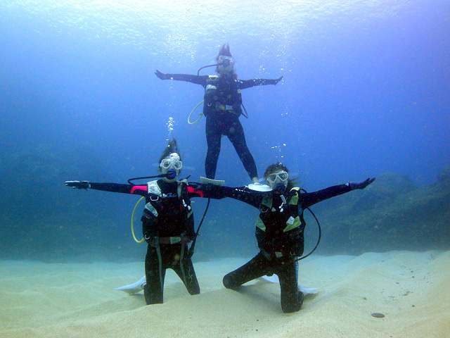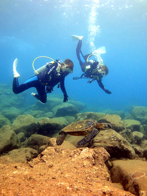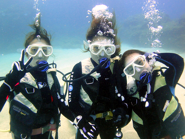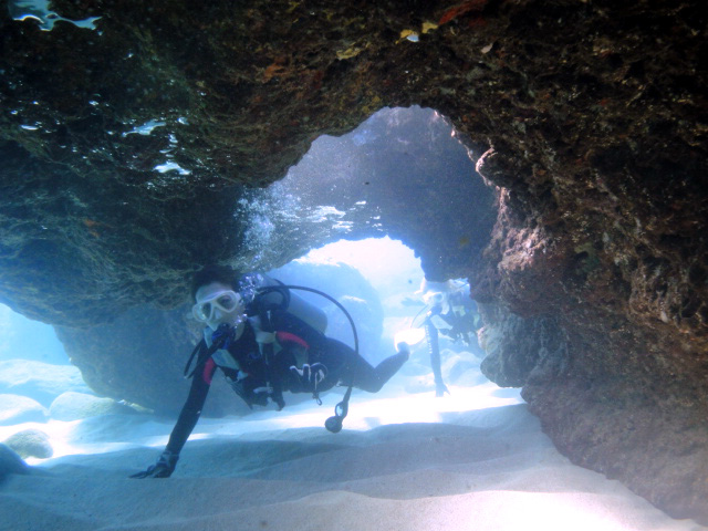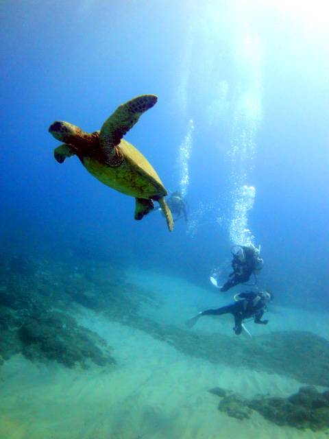 本日も晴天なり!今日は7年ぶりに大阪からお越しのSaoriさん、そしてお友達のAkikoさん&Kumikoさんを、穏やかなノースショア2ダイブへ。今日も朝7時にワイキキを出発>8時到着。“シャークスコーブ左&右”へそれぞれGO。。。今日の水中は綺麗です。光も沢山差し込みキラキラと輝いています!周りで泳ぐ沢山の魚を見ながらどんどんと沖へ。荒々しい地形で次々と変化する水中は、長いダイブタイムでも全然飽きません。途中で泳いできた海亀の後を、皆でしばらく着いて泳いだり、砂地に映る影と太陽の写真を撮ったりしながらちょうど60分間のダイビングは終了。ゆっくりと休憩時間をとり2本目のケーブへ。何時ものように魚を掻き分けて奥へ向かうと、シマハギ・クロハギ・ゴマニザの群れがいました。そして洞窟へ侵入・・・水中で見る青い光が今日も綺麗です!。更に他の洞窟を潜り抜けたら奥の砂地に到着。ここで少々時間をとり、皆で少し遊びます。先ずは水中人間ピラミッド。休憩中に打ち合わせたとおりに綺麗な形に仕上がりました!。そして次は短距離走・・・走りたいけど進まない!地面を蹴りたいけどふんわり浮いちゃってムーンサルト状態?。。。しかしこれが中々楽しい大人の砂遊びです。最後はエアリング(日本名:バブルリング)の練習。みんなで何回も試しますが、中々綺麗なリングになりません。これは次回までの宿題と言うことにしましょうか。。。二本とも、皆で思いっきり遊び、本当に楽しいダイビングが楽しめた本日でした。ALOHA!