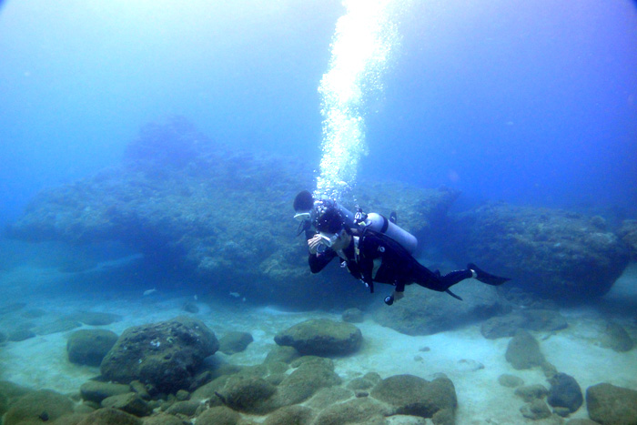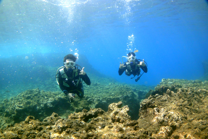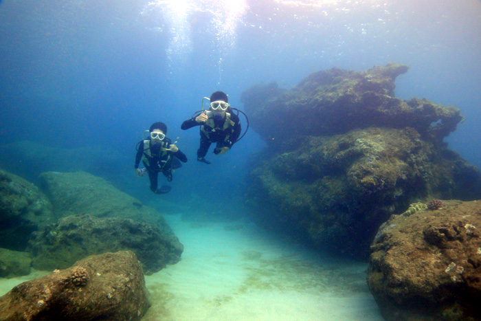 今日は、ハネムーンでハワイ入りしたついでにダイビングご参加のYoshioさん&Tomohideさん(大阪府)をノースショアへご案内。今日も海の状況はばっちり!綺麗です。ゆっくりと進みながら上から降り注ぐ太陽を一杯に浴びます。そしてシマハギ・クロハギ・ゴマニザの群れが何時ものように現れました・・・と思ったら直ぐに大きな海亀がゆったりとこちらに向かって泳いできます。目前まで近づいてくる海亀に少々驚いた感じの二人。そして洞窟へ・・・。このところ、海況は安定して穏やか。やはり夏のノースショアは殆ど毎日綺麗ですよ。ALOHA!