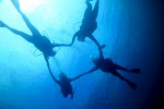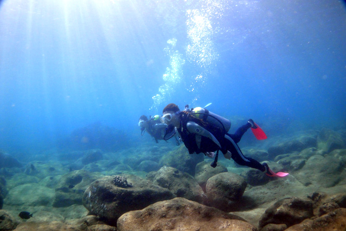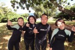 今日も晴天の中、東京からお越しのHiroakiさん&Yukoさん、そしてSaikaさん&Miekoさんをノースショアへご案内。ノースショアの海は今日も真っ平!。ゆっくりとっスタートを切り奥へ向かって泳ぎ始めると、イスズミ・ツノダシ・シマハギ・大きなカスミアジなどが辺りを沢山泳いでいます。そして今日も太陽に光が水中に差し込んで綺麗。やがて洞窟に到着~何時もの幻想的な景色は感動的!何時見ても綺麗です。洞窟を出た所で、今日は2頭の海亀がユラユラと漂っていました。早速海亀との記念写真を何枚の写します。そして他の洞窟へ・・・。他にも、シマハギ・クロハギ・ゴマニザの群れに囲まれたり、みんなで手をつなぎ輪になって記念写真を撮ったりと、ゆったりのんびり65分間のダイビングを満喫して頂きました。ALOHA!