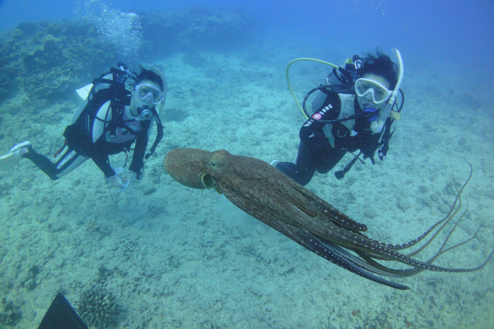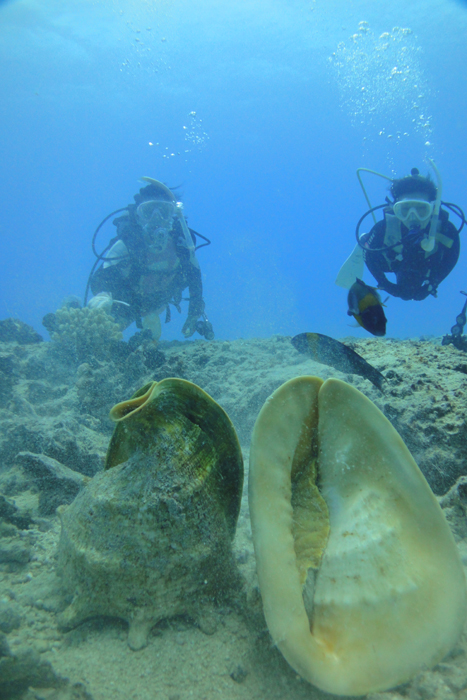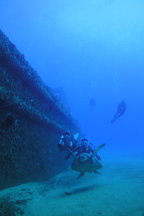 やや風が強く波も少々高めの今日は、東京からお越しのMasumiさん&Miyukiさんを東野上級ダイビングにご案内。一本目のポイントは“BigBurger”へ。水深30m、そして半径40m+見える綺麗な水中です。水底では大きな浮島が沈められており、その中を通過すると、大きな海亀が悠々と近寄ってきてくれました。流れが少々ありボートへ上がるのが少し大変でしたが、綺麗な一本目を楽しんで頂き二本目へ。2本目のポイントはAnglersReef“へ。水深14mまで下りると少しだけ砂が舞い上がっていましたが、まずまずのコンディション。ゆっくりと断層にそって移動しながら大きなタコ、そしてツノダシ・チョウハン・スズメダイ・ヤガラ、大きな貝などを見つけながら楽しんで頂きました。ALOHA!