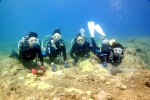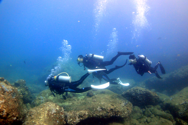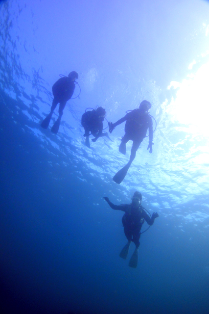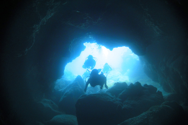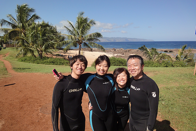祝:2011年3度目のハワイ入り!今日から四日間は、千葉・神奈川・静岡からそれぞれハワイ入りしたShinjiさん&Kaoruさん&Hitomiさん&Kentaroさん=“TheYamasitaさんファミリー”をダイビングにご案内。初日・二日目とコンディション最高のノースショアへ。何時もと変わらずキラキラとしたビーチからゆっくりとダイビング開始。静かな水中を少しずつ進むと、穏やかな水面から差し込む放射線状の光の線が眩しいくらいに綺麗です。その光に照らされて泳ぐ沢山の魚を見るだけでもため息もの・・・。そして洞窟に侵入すると、そこでもまた、真っ青に光る出口の光景は感動的な美しさです。シマハギ・クロハギ・ゴマニザの群れにも囲まれ、その他にも大きなカスミアジ・イスズミ・カレイ・ツノダシや何種類ものチョウチョウウオが次から次へと目の前に現れます。穏やかな海では気持ちもゆったりと落ち着いて、水中の生物や景色を何時も以上に楽しんで頂けますねぇ。明日と明後日の二日間も楽しんで頂きたいと思います。ALOHA!