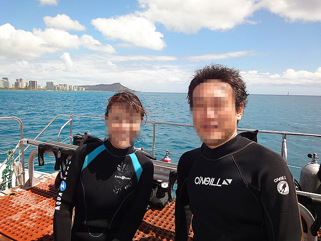 今日は、東京からお越しの刑事(デカ)長こと紅林刑事(特捜最前線)&デパガ長を南の初級ボートへご案内。一本目のポイント“WaikikiCanyons”へ。ボートの上からそこが良く見える良いコンディションの中へ向かってダイブ開始・・・っと思ったのですが、かなり緊張しているデパガ長のためにしばらく水面で練習~ようやく開始。このポイントは南の海亀ポイント、開始後直ぐに4頭の海亀がいます。そして更に移動するとまた2頭。砂地をすすみリーフを超えて、魚と海亀を楽しんで頂きました。2本目のポイントは“NautirusReef”へ。水中はこちらの方が更に青くて綺麗です。リーフに生息する沢山の魚をじっくりと見ながら、ハワイのダイビングを楽しんで頂きました。ALOHA!