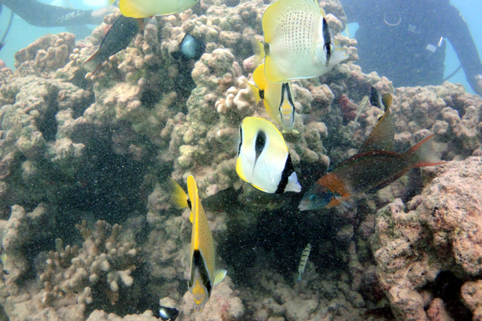 本日朝のツアーは、山口県からハネムーンでお越しのHiroshiさん&Megumiさん、そしてご友人のMinoruさんを東のビーチダイビングへ。今日は波が少し高めで何時もの穏やかさではありませんが、頑張りましょう。。。ダイビングを開始すると、やはり砂が舞い上がり水が濁っています。それでも沖に向かえば徐々に収まる海況。途中途中で魚が集まるところに止まりながらカラフルなハワイの魚を一尾々じっくりと観察。広範囲で海亀も探しましたが、今日は発見できず・・・残念!それでも皆さん余裕で楽しんで頂けた本日午前のツアーでした。Hiroshiさん&Megumiさん、お幸せに・・・ALOHA!
